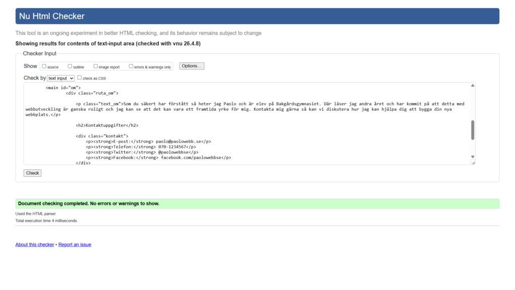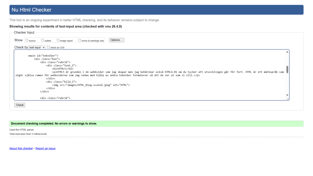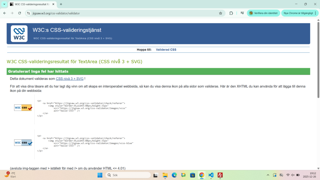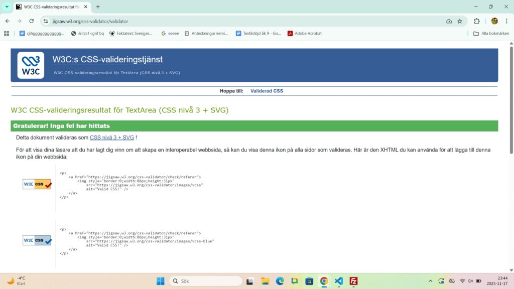 Det svåra tycker jag var CSS-koden, särskilt när man skulle få till avstånden mellan de olika rubrikerna och länkarna, och se till att länkarna både såg bra ut och var tydliga att klicka på samt att man förstod vad varje länk betydde. Men jag tycker ändå att sidan blev bra och det var roligt att se resultatet, även om det var ganska jobbigt att göra.