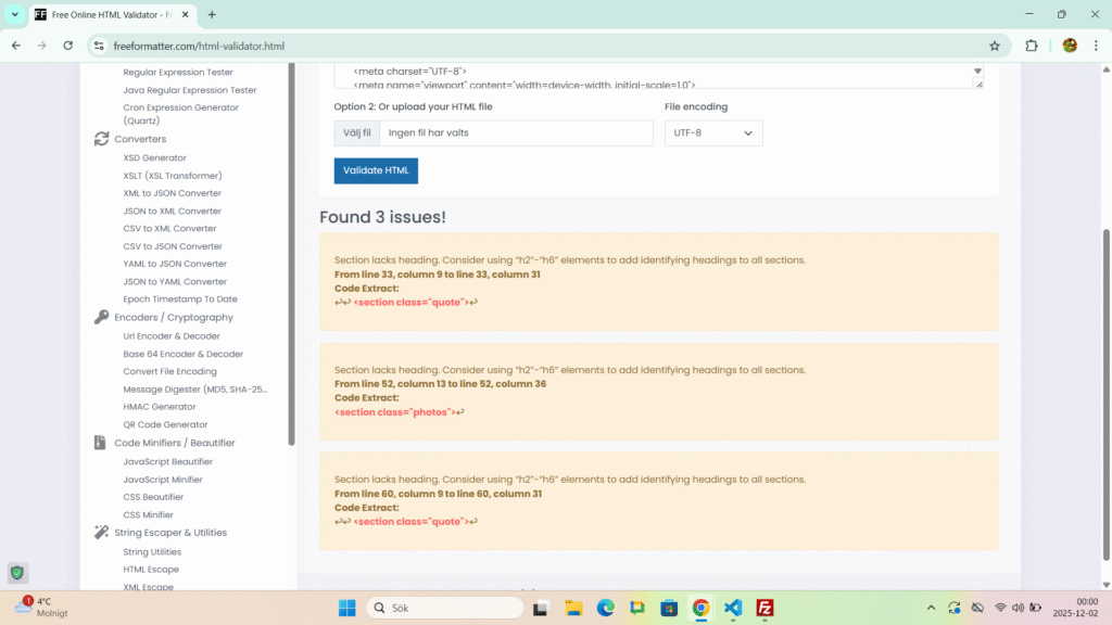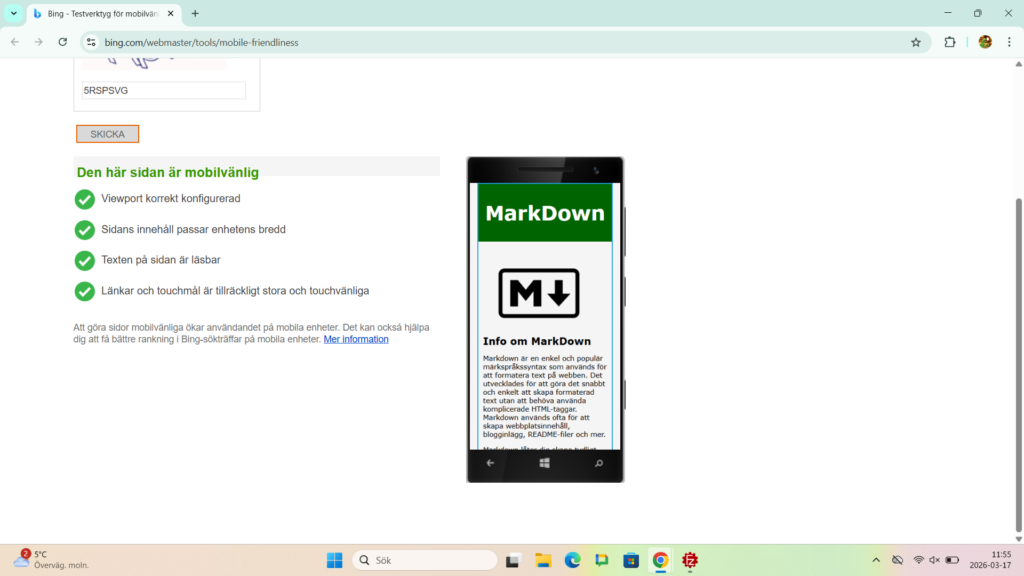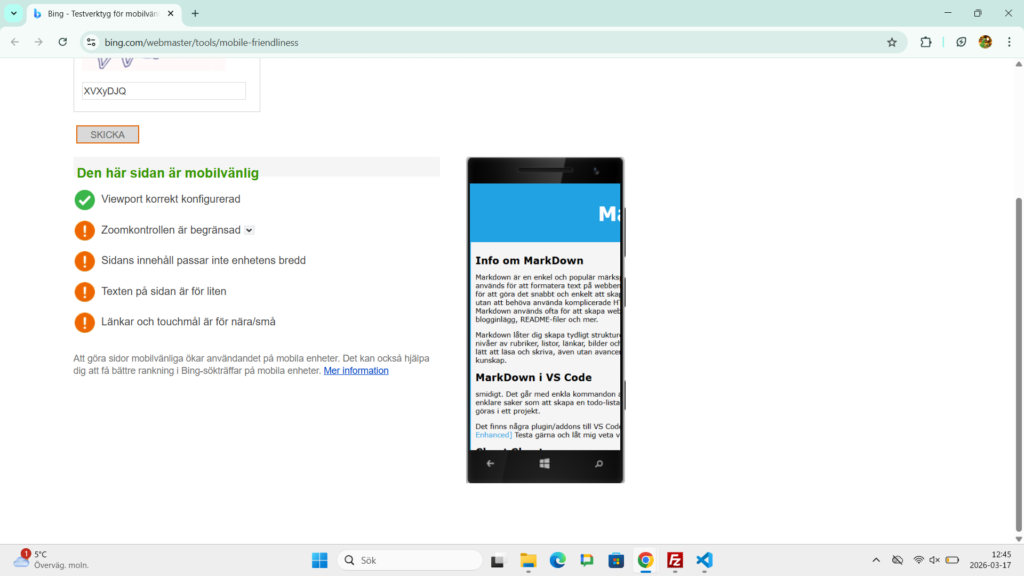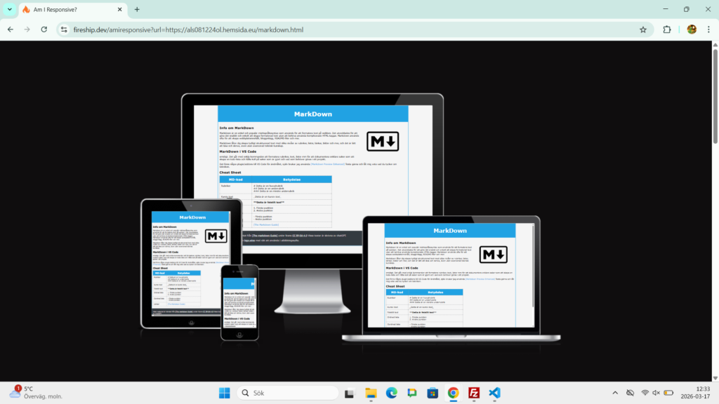 Jag börjar med media queries, som jag använde för att anpassa en tidigare uppgift, Markdown, som från början inte var mobilvänlig. Genom att använda media queries kunde jag justera layouten så att den fungerar bättre på mindre skärmar. Nedan kan du se hur sidans mobilvänlighet var innan, och sedan hur den nya versionen ser ut i olika storlekar och om den är mobilvänlig:
