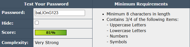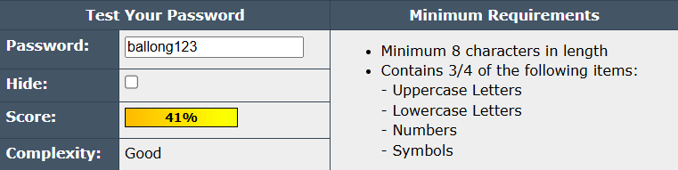 I mitt första “försök” så valde jag ett lösenord som ses ganska halvbra. Den har små bokstäver och siffor som gör den hyfsat säker (41%). Men lösenordet är inte så praktiskt eftersom jag gör den enkla sifferordningen 1, 2 och 3 som är det som kommer testas först om någon försöker lista ut det.