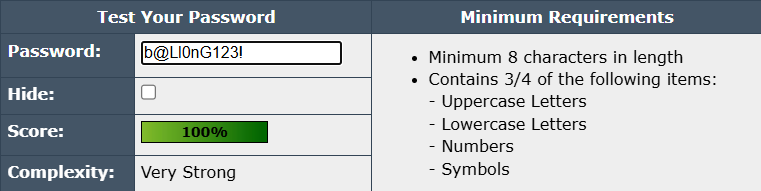 I sista bilden kan vi se att det är 100 % säkerhet. Det jag ändrade och lade till var ett snabel-a (@) istället för det vanliga a:et. Sedan ändrade jag o:et till en nolla och lade till ett utropstecken i slutet av lösenordet.