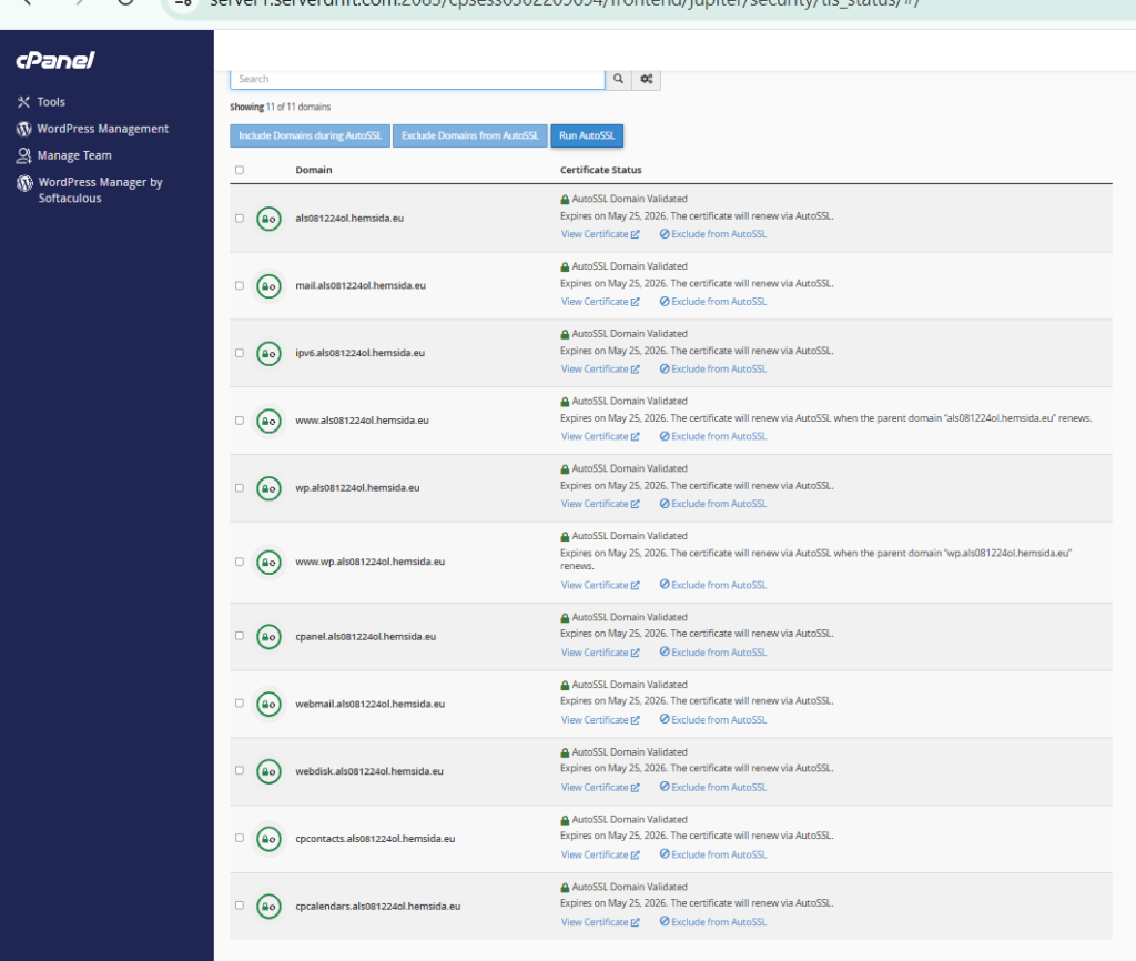 Jag kontrollerade SSL/TLS status i cPanel. Alla relevanta domäner hade AutoSSL Domain Validated aktivt (grönt hänglås). Jag har även kontrollerat domänerna under Domains och aktiverat Force HTTPS Redirect så att webbplatsen använder HTTPS.