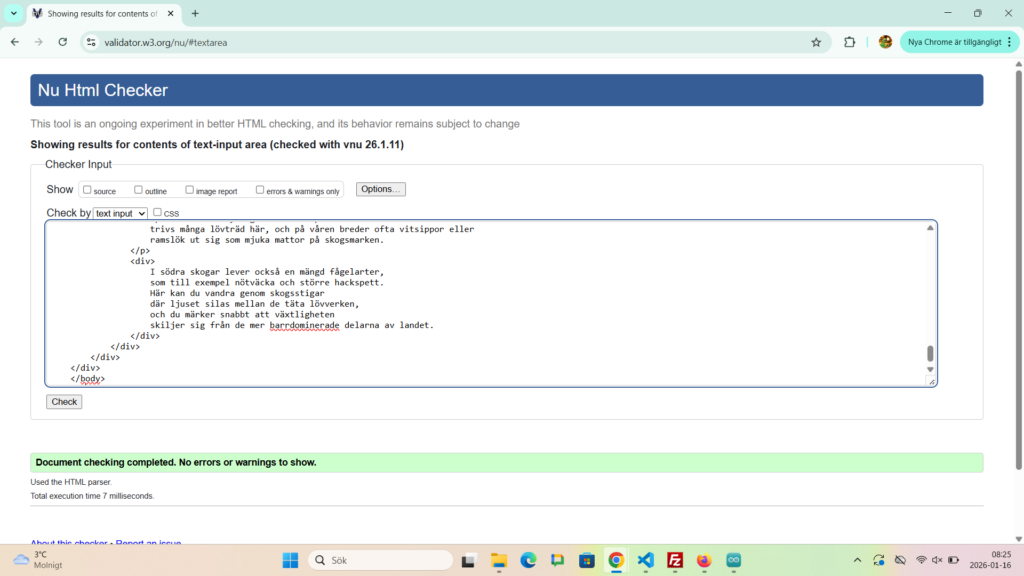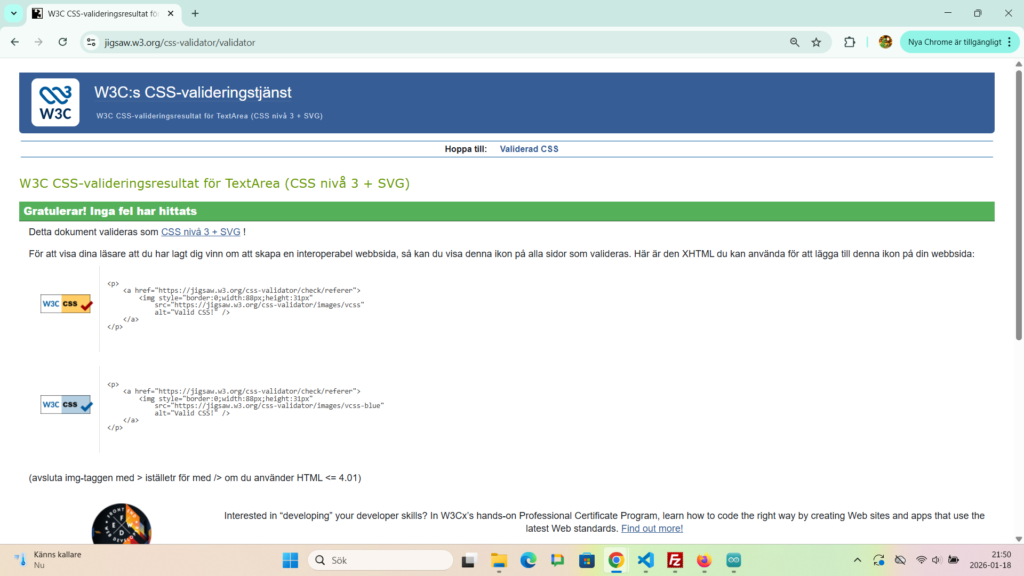 Efter dessa ändringar validerade jag sidan igen och nu visar valideringen inga fel. Nedan kan man se resultaten från HTML- och CSS-valideringen.