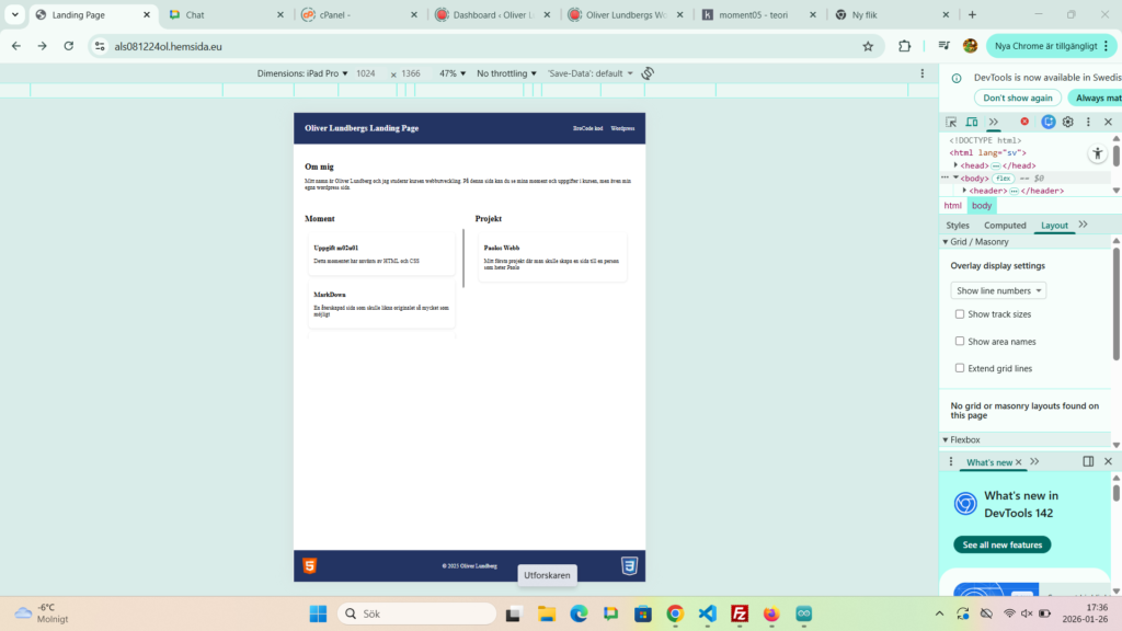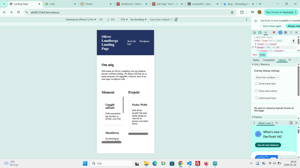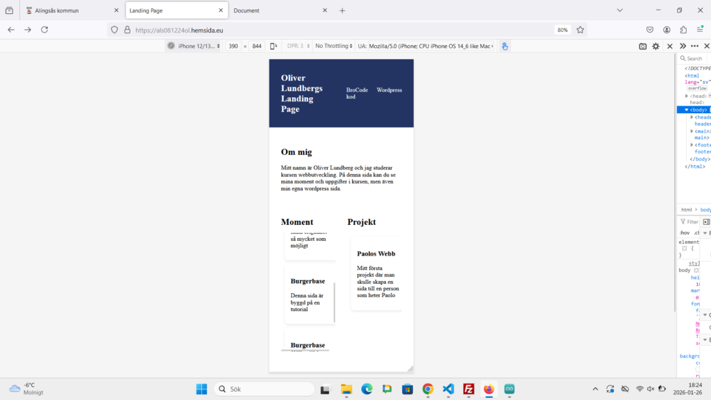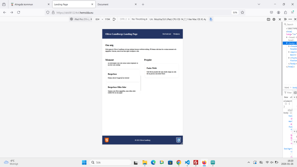 Bilderna som visas nedan är tagna i Chrome och Firefox och visar hur sidan ser ut på en iPhone 12 Pro och en iPad Pro. Det var heller ingen större skillnad mellan hur sidan såg ut i Chrome jämfört med Firefox. Däremot gillar jag inte helt att footern på iPad-versionen alltid hamnar längst ner på skärmen. Detta beror på att sidan använder flexbox, där <body> är en flex-container med flex-direction: column. Eftersom <main> har flex: 1 fyller den ut allt tillgängligt utrymme mellan header och footer, vilket gör att footern automatiskt placeras längst ner även när sidan inte har så mycket innehåll.