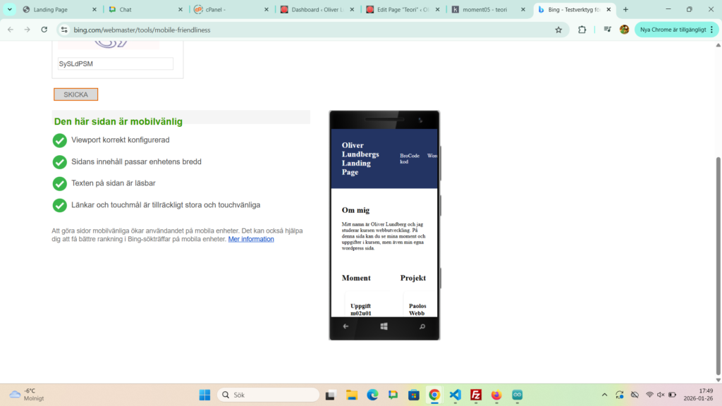 Jag har kollat användarvänligheten på min landing page. Som man kan se på bilderna nedan är sidan mobilvänlig, som jag faktiskt blev lite förvånad över. Däremot tycker jag inte själv att den ser helt perfekt ut i mobilformat, och det finns saker som kan förbättras. Just nu har jag dock inte bestämt exakt vilka ändringar jag ska göra.