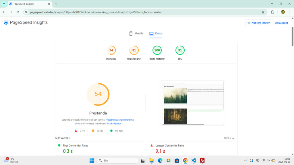 Jag undersökte prestandan på Skog-hemsidan med tre olika tjänster, där PageSpeed var den som visade på sämst prestanda. Samtliga verktyg gav liknande resultat och pekade på samma problem som var bildhanteringen. Bilderna var felaktiga i storlek och betydligt större än vad som behövdes på sidan.