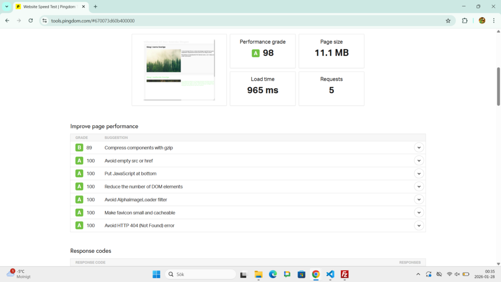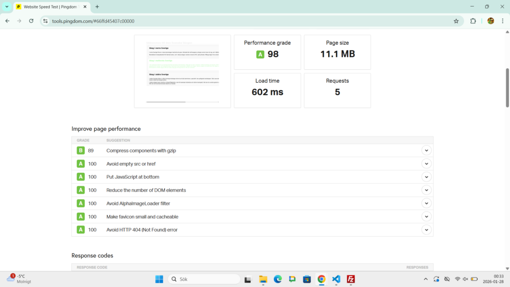 Därefter testade jag att komprimera webbplatsens kod. Efter komprimeringen kunde en mindre förbättring av prestandan observeras, men skillnaden var väldigt liten och förändrade inte problemen som fanns.