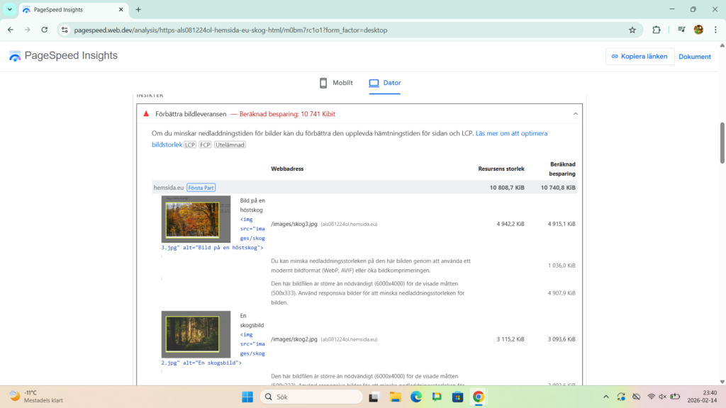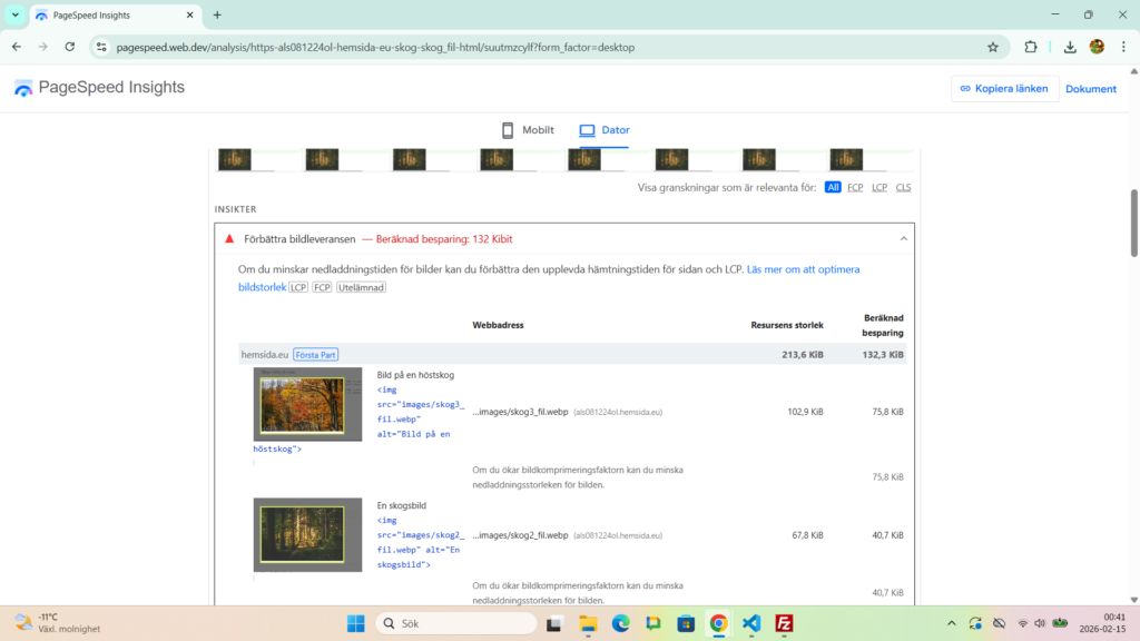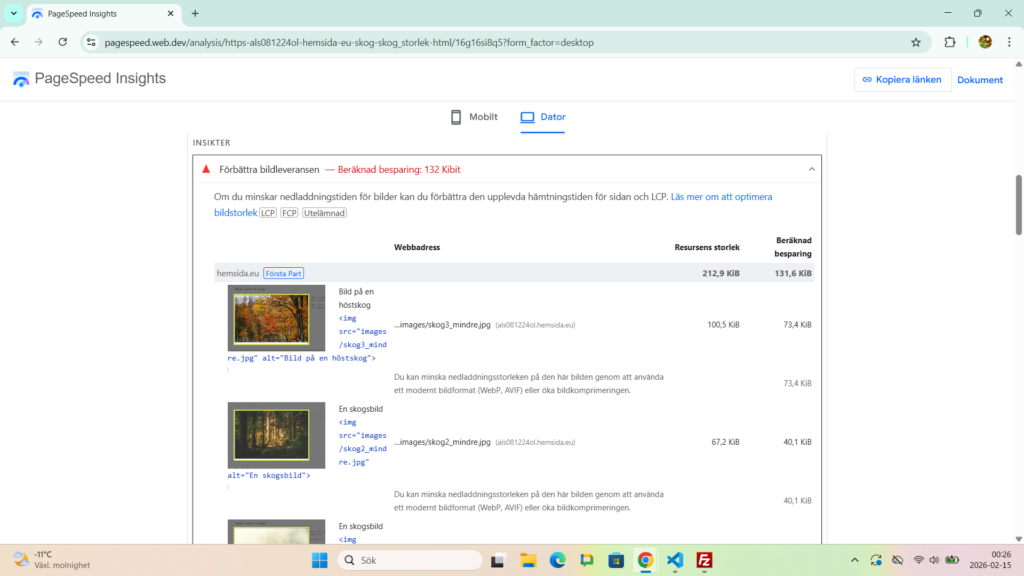 Nedan visas en bild som visar prestandan för bilderna på sidan. Som man kan se är bildprestandan inte särskilt bra. Programmet visar att bilderna är onödigt stora och inte anpassade efter hur de visas på sidan.