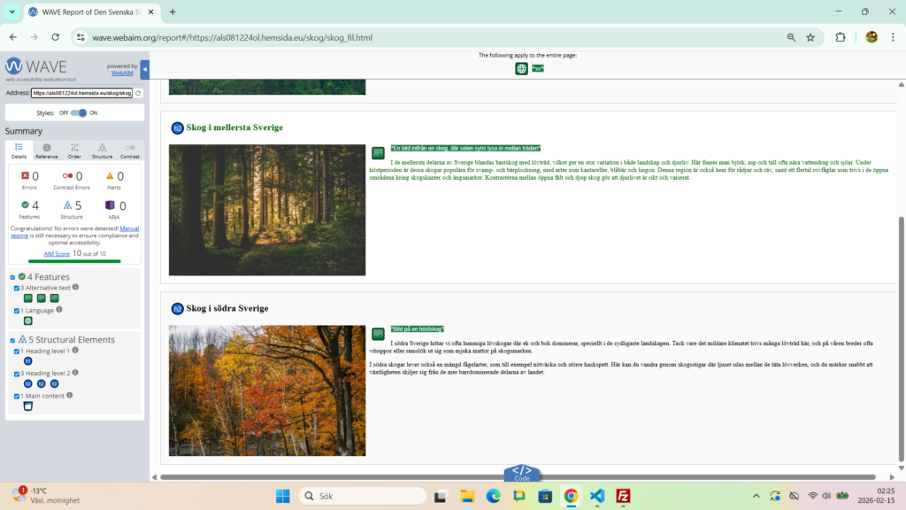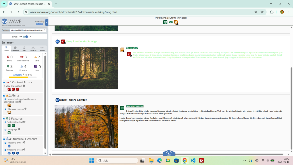 Jag har validerat en webbsida som skapats av GPT och åtgärdat de problem som valideringen visade. Vissa var småfel som inte störde sidan, till exempel stavfel i CSS och element som inte var stängda korrekt. Jag lade även till alt-text på bilder som saknade det, så att sidan blev mer tillgänglig för synskadade användare.